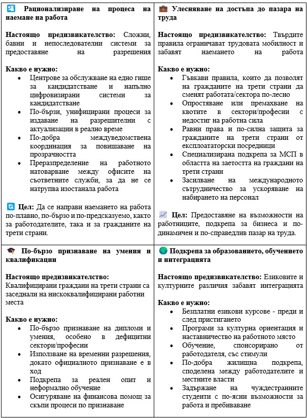 - Липсата на връзка между институциите и сложните бюрократични процедури водят до несигурност и неефективност. Работодателите призовават за по-голяма координация между министерствата, административните звена и службите по заетостта.